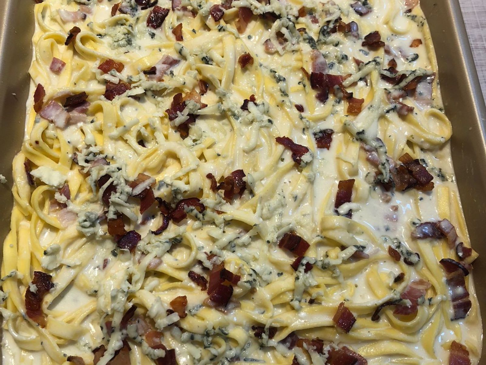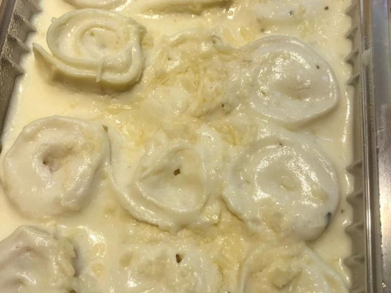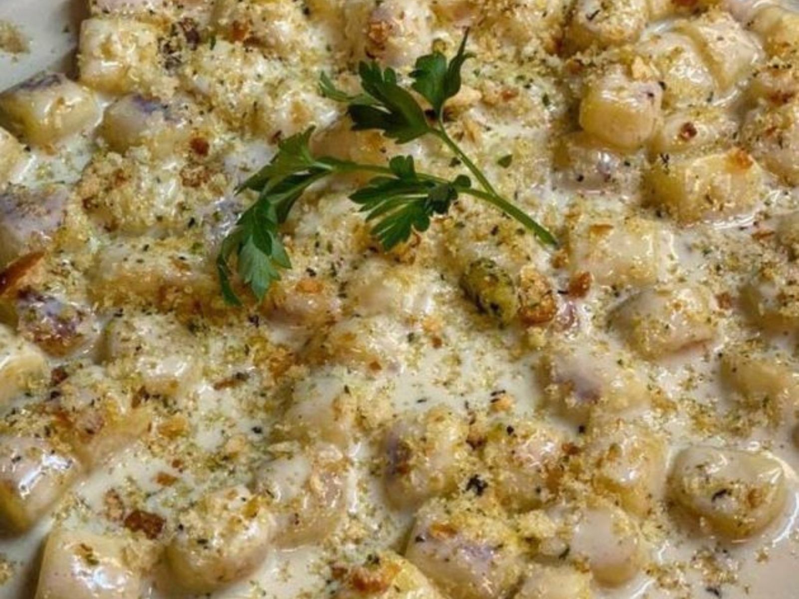 Nhoque gratinado de mandioquinha com fonduta de gorgonzola e farofinha de ervas